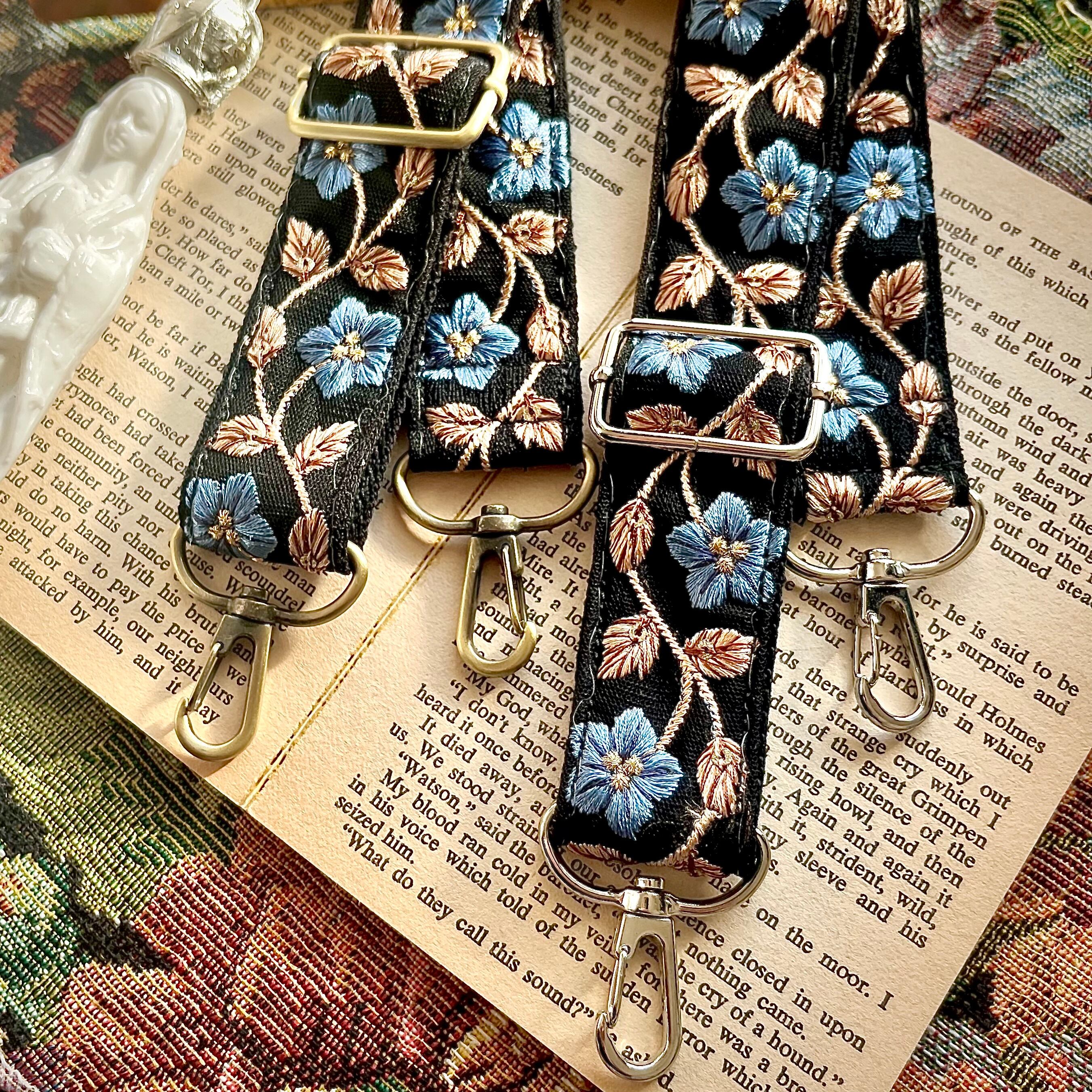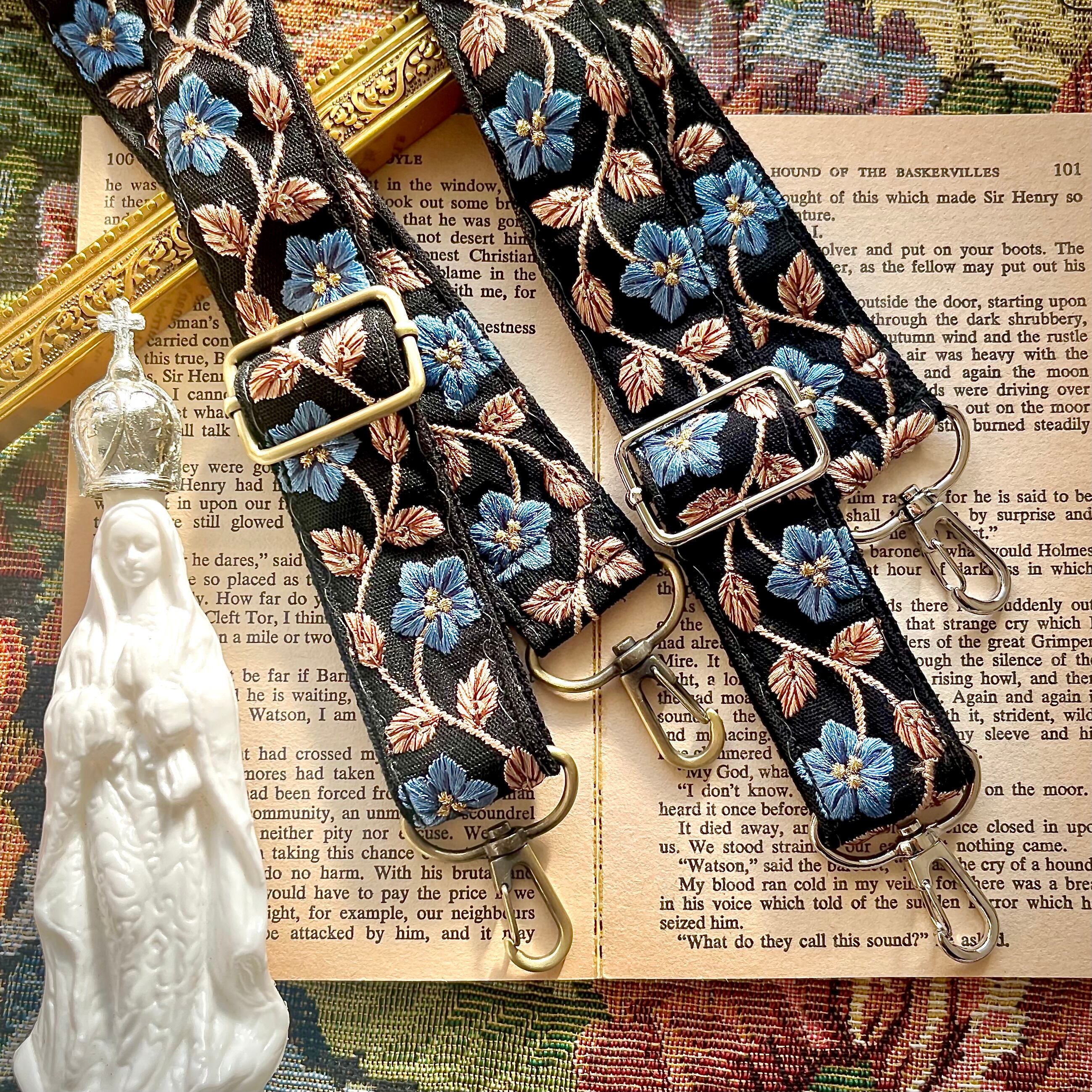 青と茶色のインド刺繍が施されたリボンショルダー紐です。目を引く華やかなデザインが、どんなスタイルにもマッチします。中華服、和服、洋服、全てに合います。